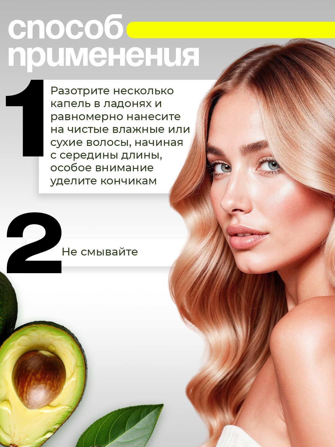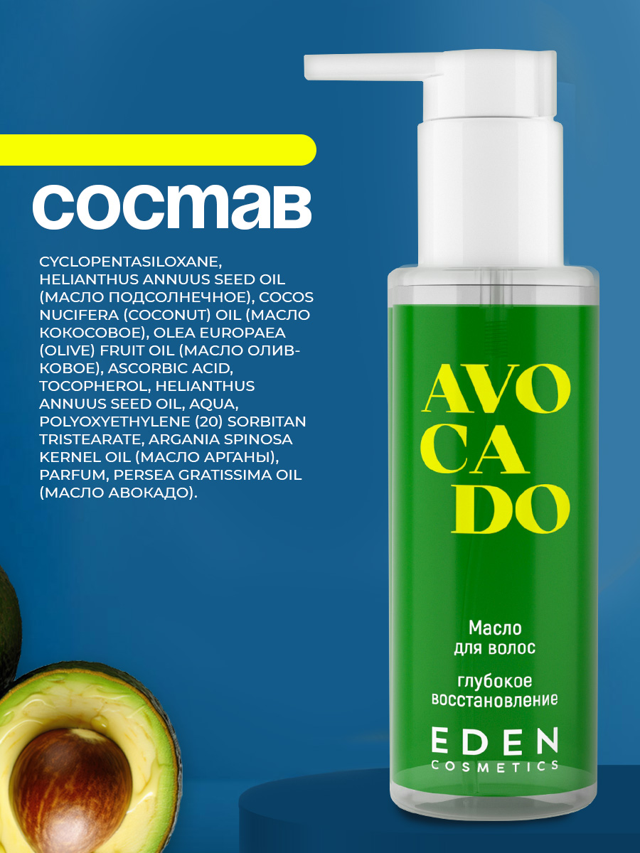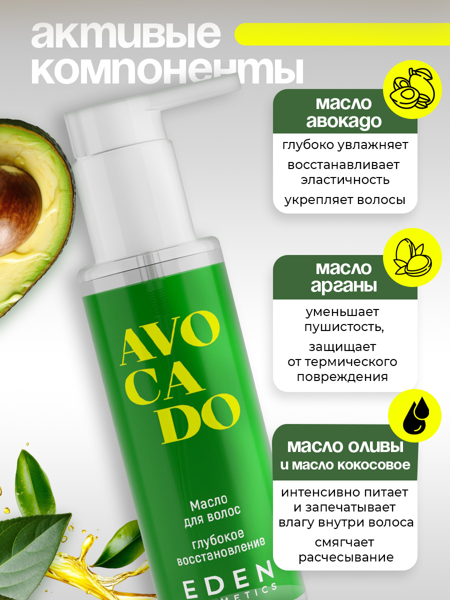 Формула с комплексом ценных масел (авокадо, арганы, оливы, кокоса) проникает в структуру волос, укрепляет их изнутри, интенсивно питает, помогает предотвратить сечение кончиков.