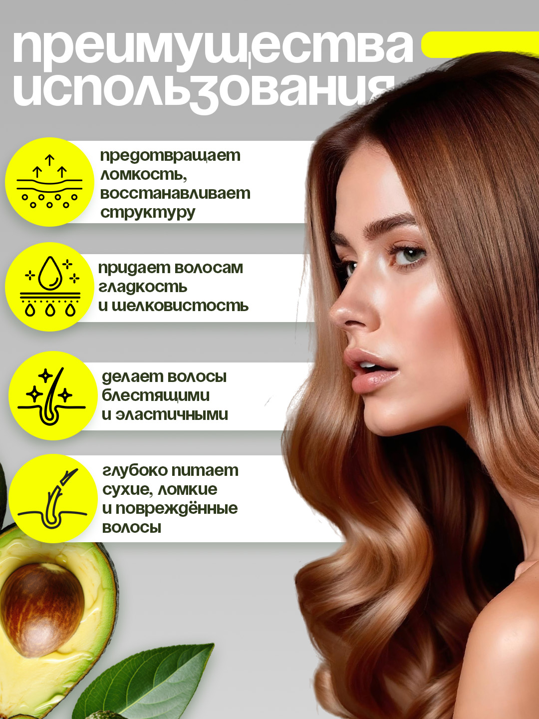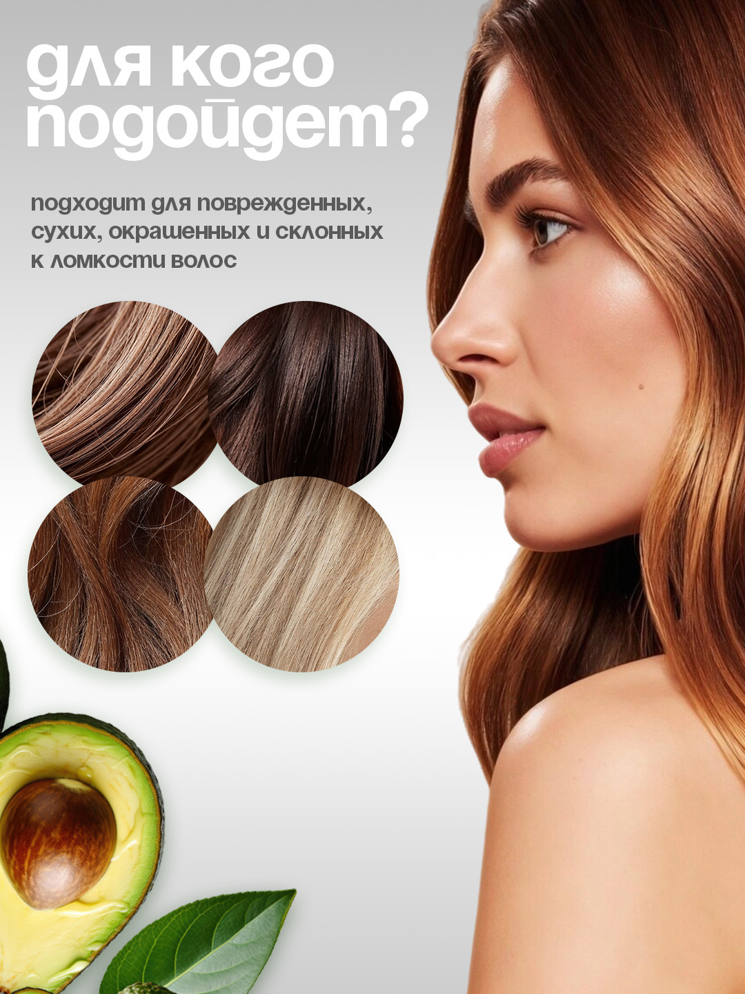 Масло для волос AVOCADO мгновенно придаёт гладкость и сияние сухим, повреждённым волосам, легко распределяется и облегчает расчёсывание.