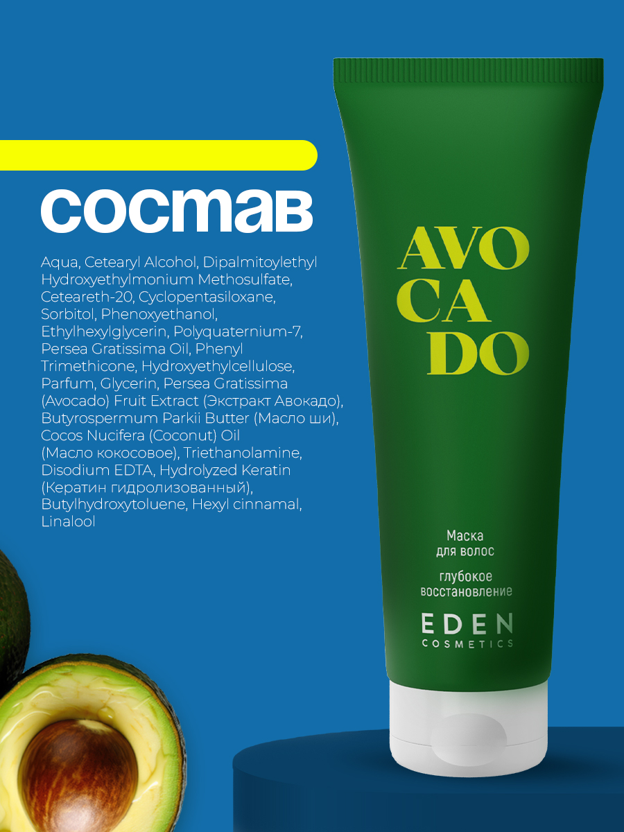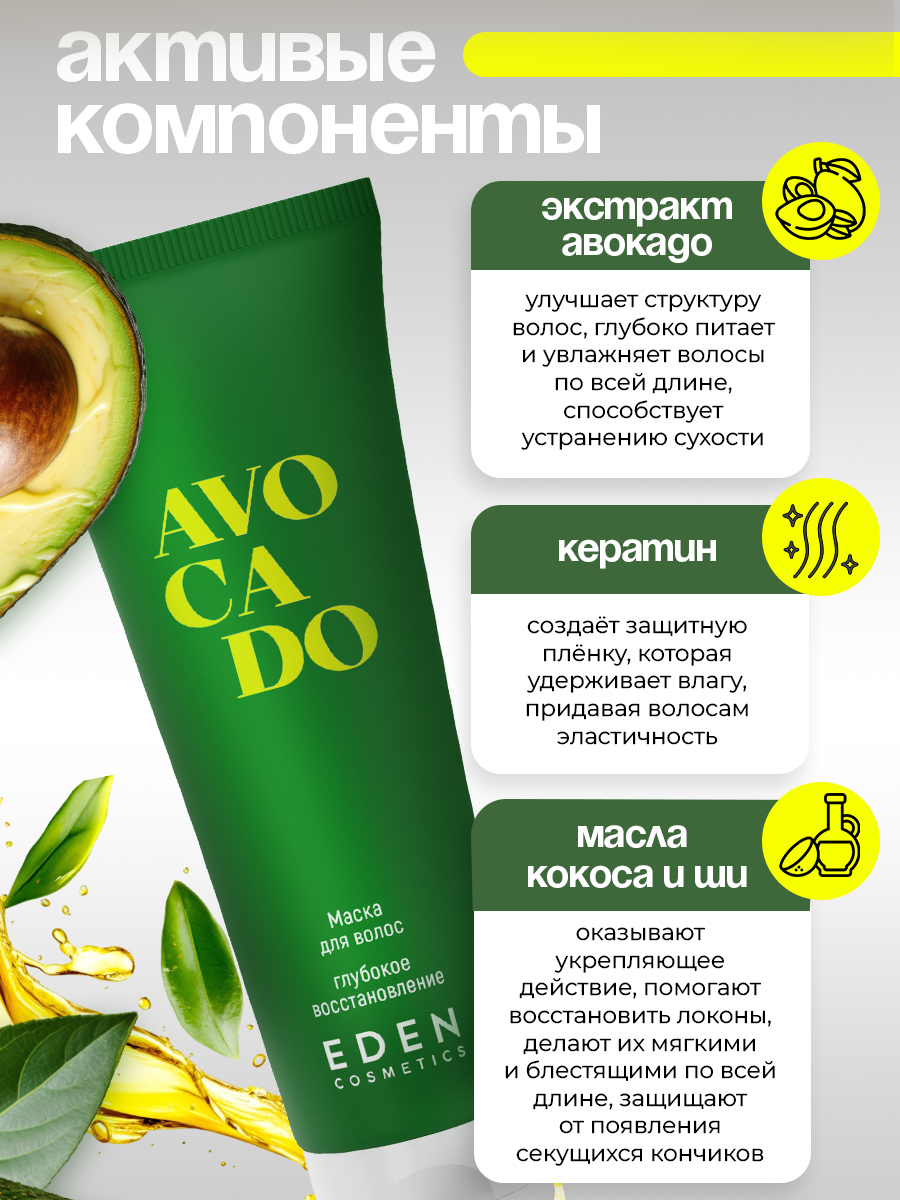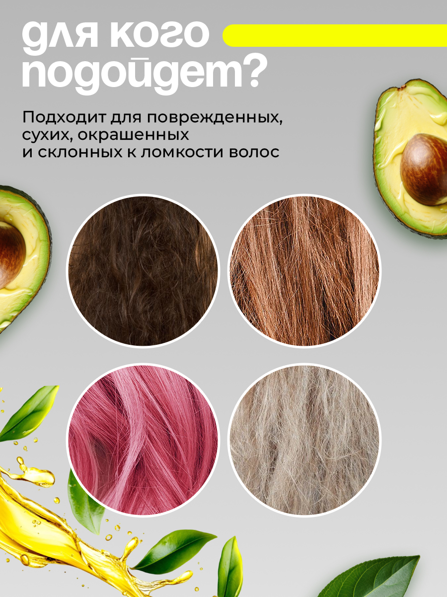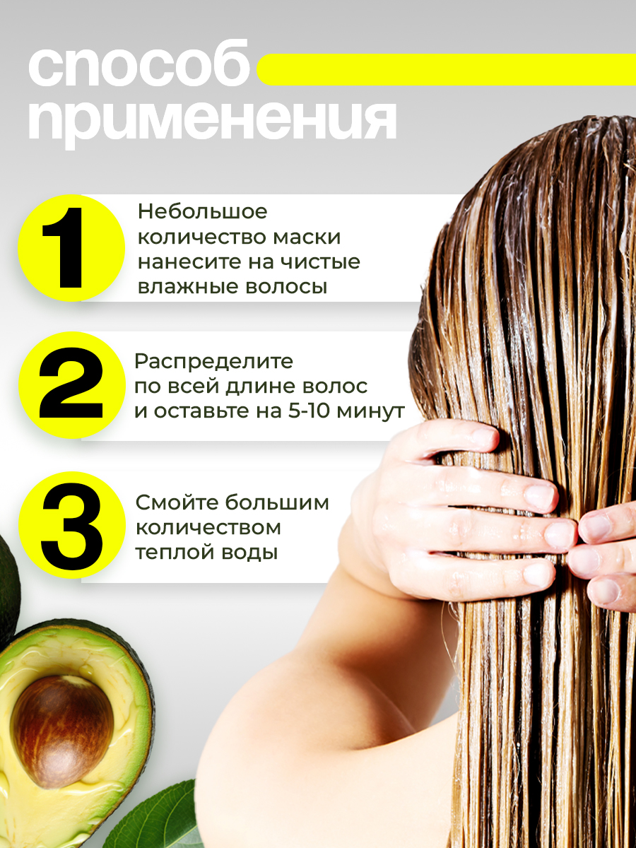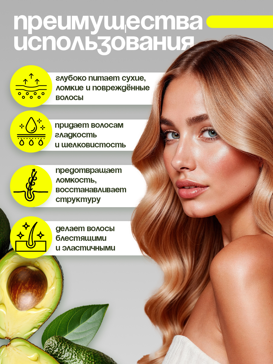 Маска для волос AVOCADO благодаря активным компонентам состава глубоко насыщает сухие, ломкие и повреждённые волосы питательными веществами, способствует интенсивному восстановлению их структуры, придаёт волосам живой блеск и эластичность.