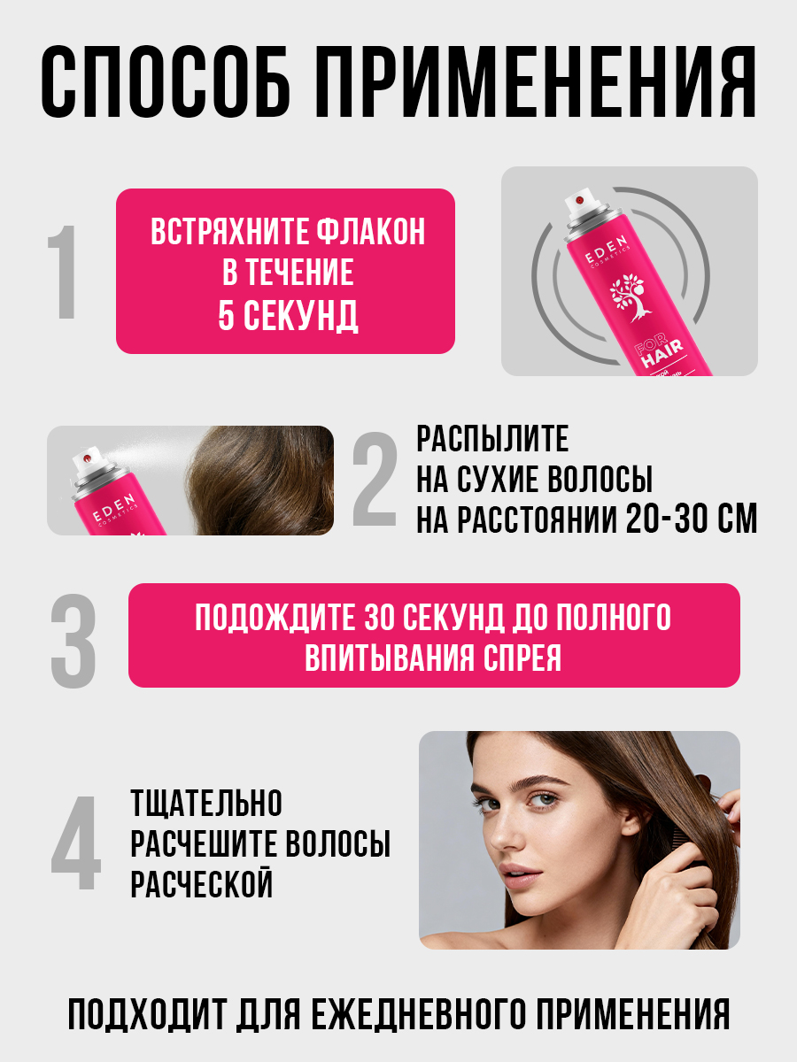 Способ применения: Тщательно встряхните баллон и распылите средство на сухие волосы с расстояния 20-30 см, уделяя особое внимание корням. Подождите 30-60 сек, затем массирующими движениями распределите средство по волосам. После высыхания волос расчешите их или приступайте к укладке.