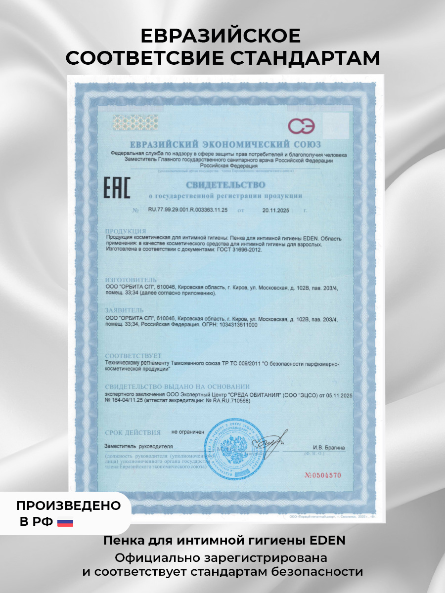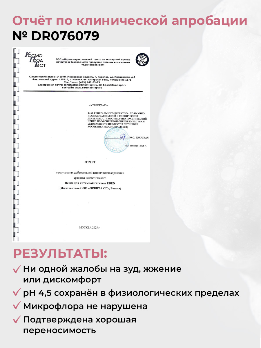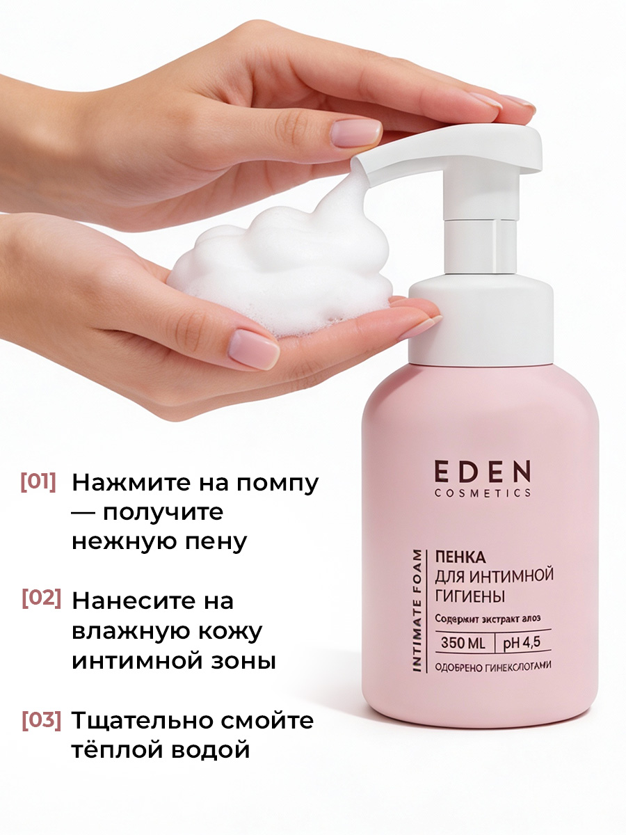 Способ применения: Небольшое количество пенки выдавите на ладонь, распределите на влажные области интимной зоны. Тщательно смойте тёплой водой.
