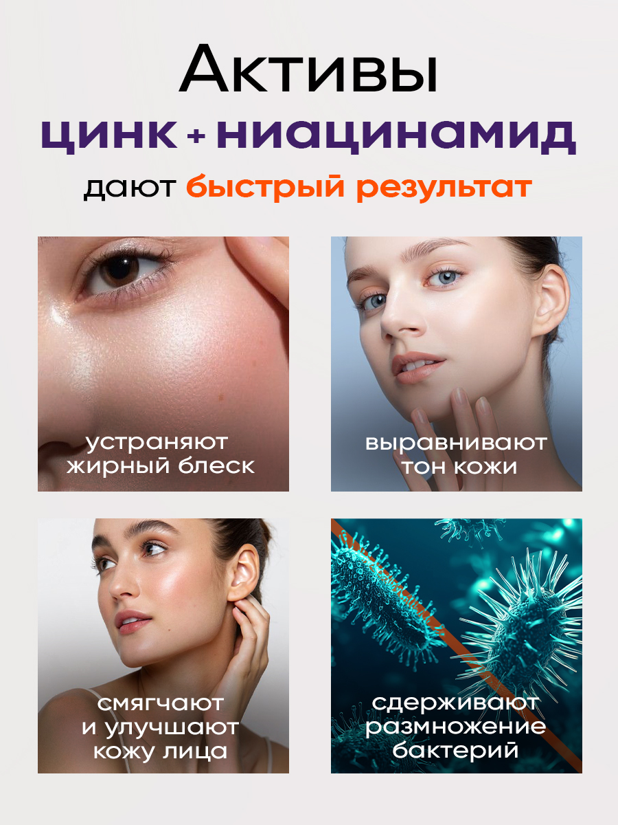 Цинк устраняет жирный блеск, сдерживает размножение бактерий, вызывающих акне.