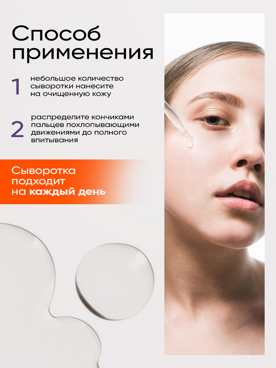 Способ применения: Небольшое количество сыворотки нанесите на очищенную кожу, распределите кончиками пальцев. Можно использовать точечно.