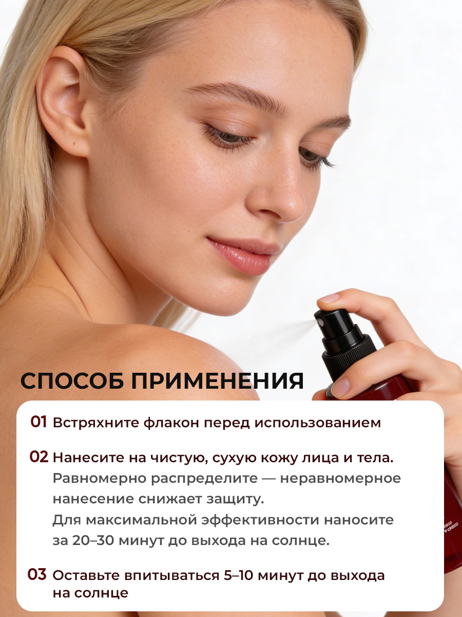 Способ применения: Нанесите достаточное количество средства на кожу тела за 30 минут до выхода на солнце. Рекомендуется повторять нанесение каждые 2 часа и\или после купания. Неравномерное распределение может значительно снизить уровень защиты.