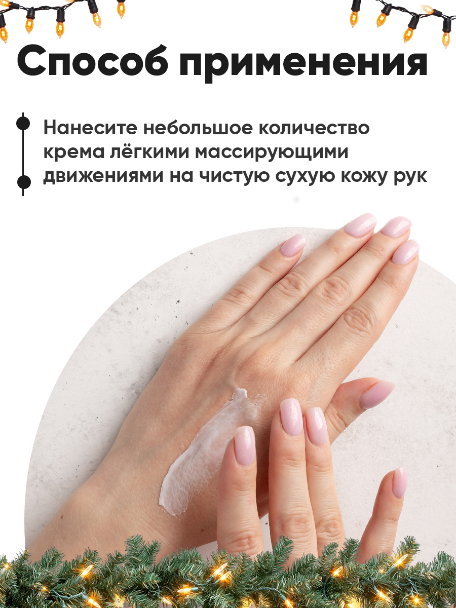 Способ применения: Нанесите небольшое количество крема лёгкими массирующими движениями на чистую сухую кожу рук.